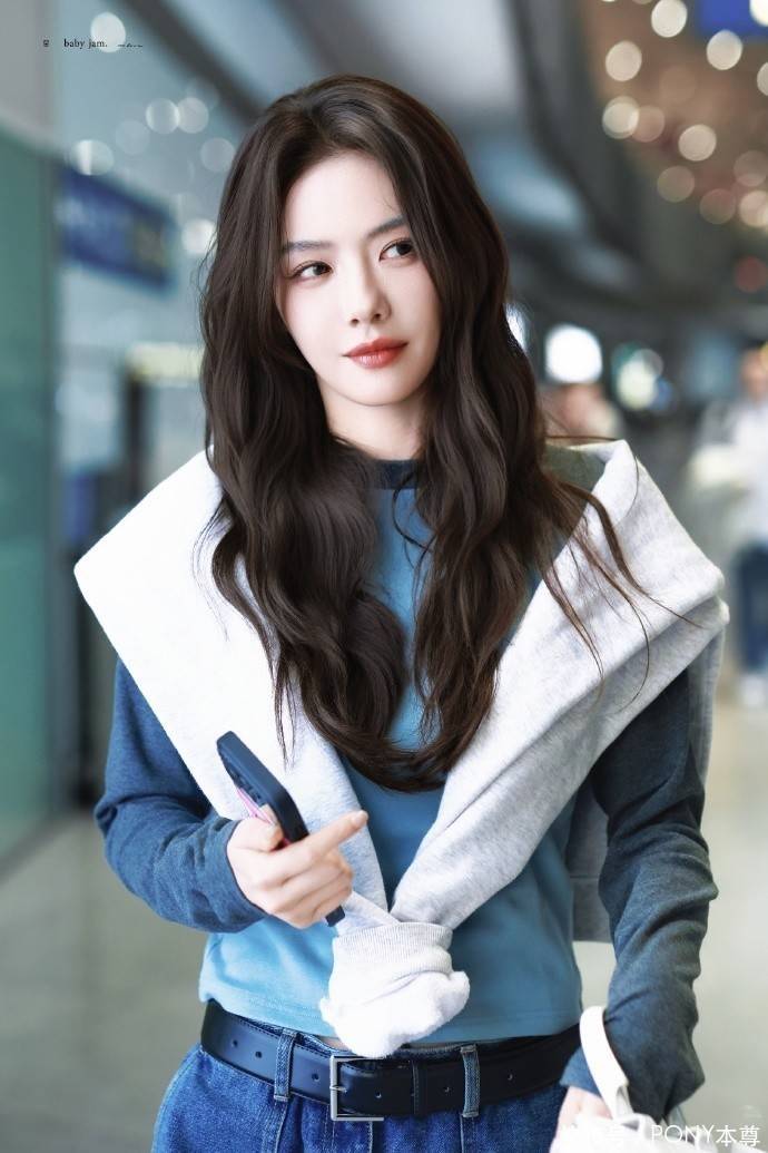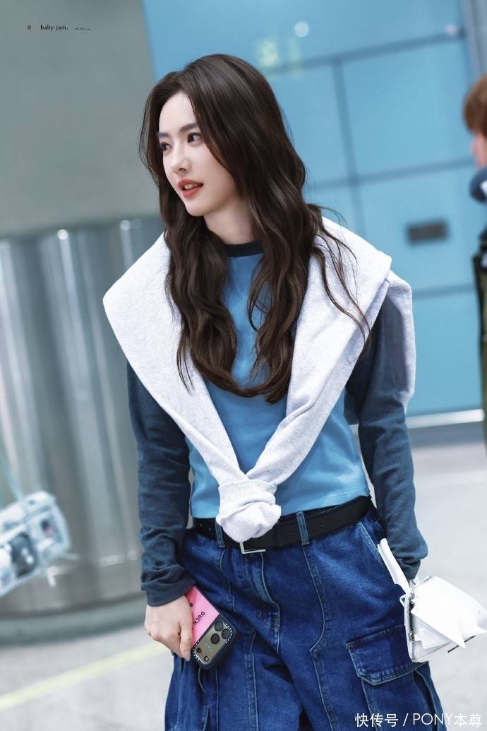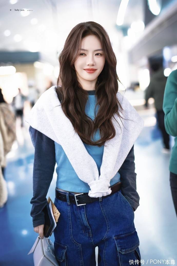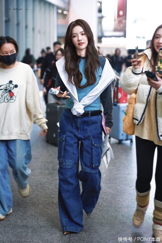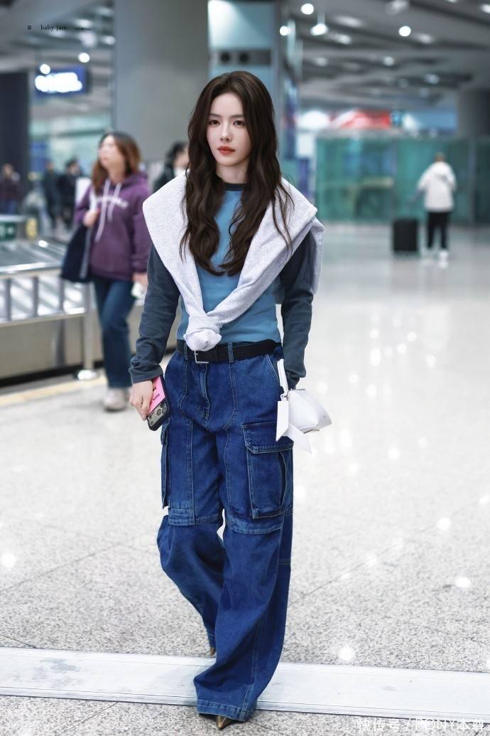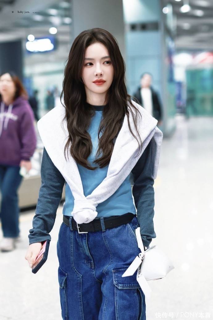 蔡文静此次的穿搭,将 “层次感” 与 “色彩呼应” 演绎得淋漓尽致。上半身,她选择了一件蓝色撞色插肩袖长 T 恤作为内搭,蓝色本身自带清新感,在秋季的沉闷氛围中格外亮眼,插肩袖设计则增添了几分休闲与随性,避免了常规 T 恤的单调。更巧妙的是,她在外面搭配了一件灰白色卫衣作为披肩,这种 “披肩式” 穿法不仅在秋季能起到保暖作用,还瞬间为造型增加了层次感,灰白色与蓝色形成柔和对比,整体色调和谐统一,既不浮夸又充满设计感,完美平衡了休闲与时尚。