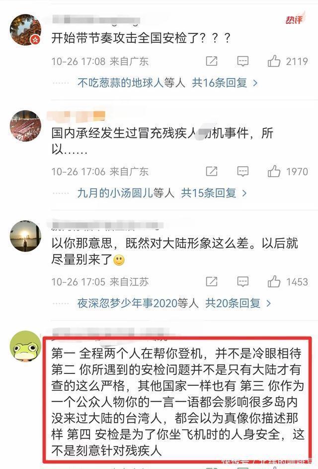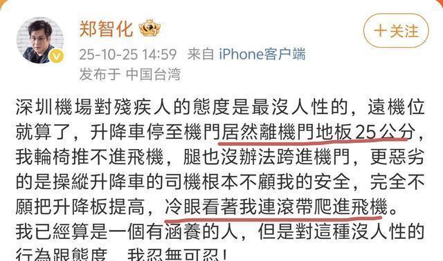 他分享从深圳机场飞往台北的经历,称航班停靠远机位后,升降机与机门的25公分落差让轮椅无法通行,自己只能“连滚带爬”进机舱,还指责现场司机“冷眼旁观、不予协助”。
