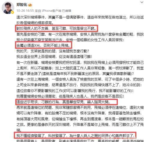 面对质疑,郑智化再次发文回应。 没有承认自己夸大事实,反而列举南京机场安检时要求他的金属假肢过X光等经历,直言“残疾人出行总遭刁难,机场对残障人士不友善是普遍现象”。